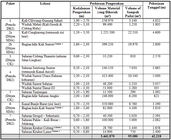 Untuk pengerukan 10 sungai, empat waduk dan satu kanal, volume lumpur galian yang memerlukan pembuangan diperkirakan sekitar 3,5 juta m3. Dari hasil pengerukan, sampah akan dibuang ke Bantar Gebang, bahan beracun berbahaya (B3) akan dibuang ke Cibinong dan lumpur akan dibuang ke Ancol.