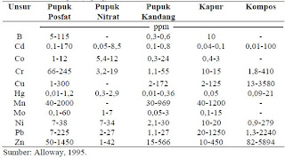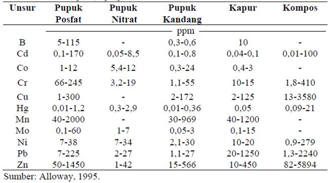 Pemasok logam berat dalam tanah pertanian antara lain bahan agrokimia (pupuk dan pestisida), asap kendaraan bermotor, bahan bakar minyak, pupuk organik, buangan limbah rumah tangga, industri, dan pertambangan (Alloway, 1995).