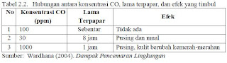 a. sumber : emisi kendaraan bermotor. b. dampak : CO yang ikut dalam aliran darah akan membentuk karboksihaemoglobin (COHb). COHb merupakan senyawa yang stabil sehingga fungsi darah sebagai pengangkut oksigen terganggu. Keracunan gas CO ditandai dengan pusing/ bingung, sakit kepala, dan mual. Keadaan lebih berat berupa menurunnya kemampuan gerak tubuh, gangguan kardiovaskular, serangan jantung, sampai pada kematian.
