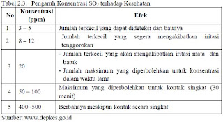 a. sumber : pembakaran dari kegiatan rumah tangga/ domestik, pembangkit tenaga listrik, kilang minyak, pabrik baja/ logam. b. Dampak : menimbulkan efek iritasi pada saluran nafas, sehingga menimbulkan gejala batuk, sesak nafas (meningkatkan kasus asma)