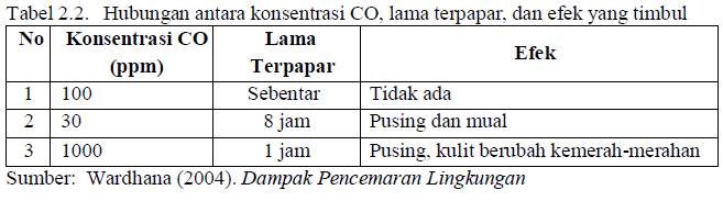 a. sumber : emisi kendaraan bermotor. b. dampak : CO yang ikut dalam aliran darah akan membentuk karboksihaemoglobin (COHb). COHb merupakan senyawa yang stabil sehingga fungsi darah sebagai pengangkut oksigen terganggu. Keracunan gas CO ditandai dengan pusing/ bingung, sakit kepala, dan mual. Keadaan lebih berat berupa menurunnya kemampuan gerak tubuh, gangguan kardiovaskular, serangan jantung, sampai pada kematian.